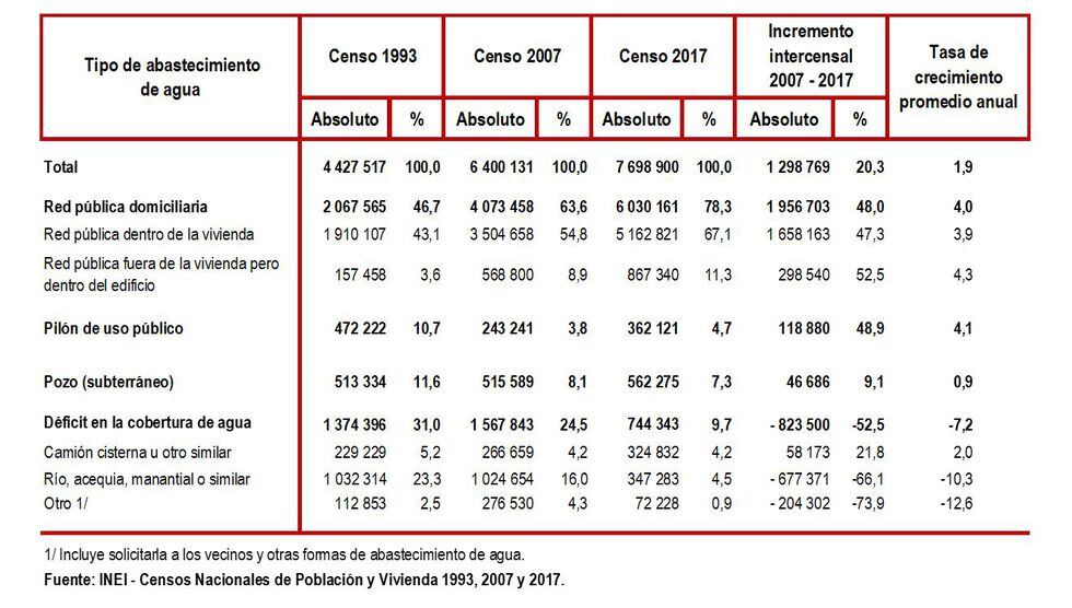 Según las cifras censales, lo que más se ha incrementado es el acceso al agua vía los pilones, que en los últimos 10 años -entre el censo del 2007 y 2017- ha crecido 4.1% en promedio anual, mientras que, en el mismo periodo, las viviendas al acceso agua vía la red pública tuvo un incremento de 4% anual, desde el 2007.