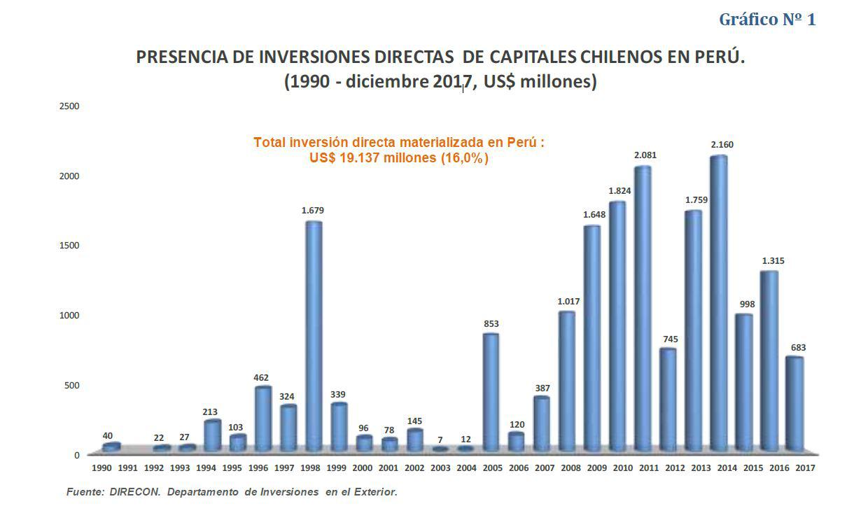 El interés por inversionistas chilenos en Perú, no cesa. Prueba de ello es que –en los últimos 27 años– las inversiones directas de capitales chilenos en Perú sumaron cerca de US$ 20,000 millones de acuerdo a ProChile, institución que promueve las exportaciones de bienes y servicios del país sureño.