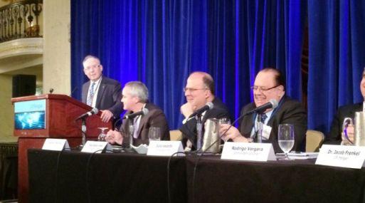 En esta exposición, Velarde estuvo acompañado de Jacob Frenkel (ex Gobernador del Banco Central de Israel), y los Presidentes de Bancos Centrales de Chile (Rodrigo Vergara) y Colombia (José Darío Uribe).