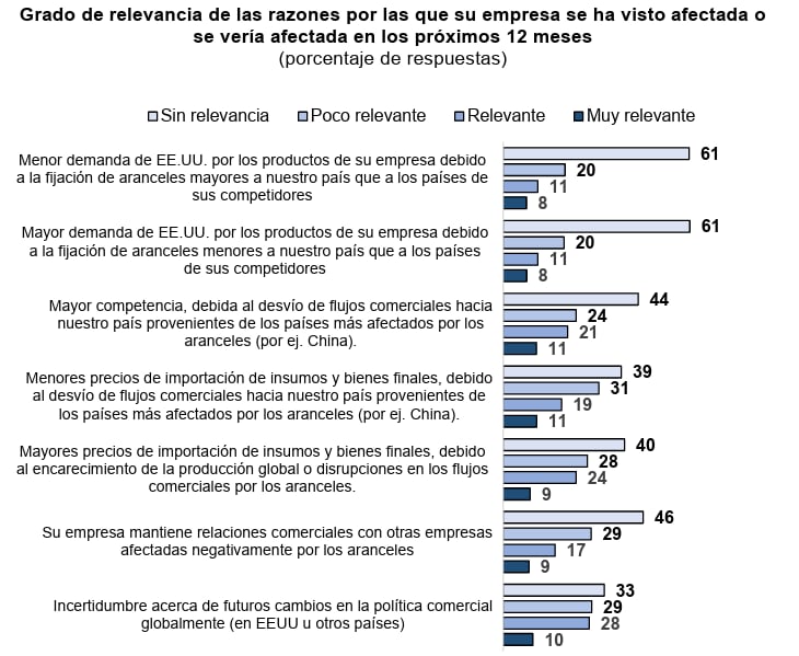 Este fue el caso también de observar una “mayor competencia, debida al desvío de flujos comerciales hacia nuestro país provenientes de los países más afectados por los aranceles (por ej. China)”, donde el 44% de los consultados apuntó que no tendrá efecto alguno.