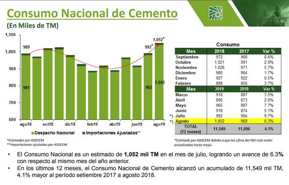 El consumo nacional de cemento alcanzó las 1,052 mil toneladas en agosto , informó la Asociación de Productores de Cemento (Asocem), alcanzando así su nivel de consumo más alto en lo que va del año. El consumo nacional de cemento registró un avance de 6.3% respecto al mismo mes del año anterior.