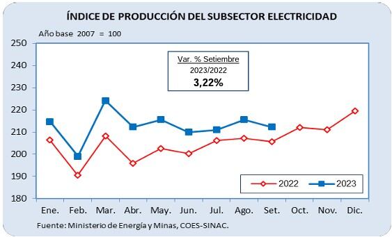 En setiembre, la producción de electricidad avanzó en 3.22% con respecto al mismo mes del 2022. Sin embargo, el índice se contrajo tres puntos (212.3) desde lo registrado en el mes de agosto (215.6) y se aleja del punto más alto de producción del año (224.2 en marzo).