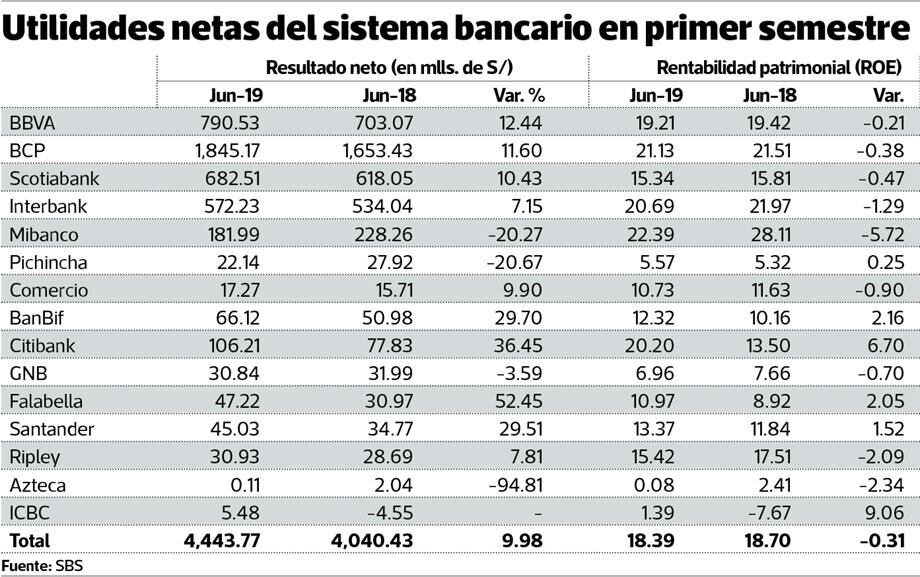La rentabilidad patrimonial (ROE) de los 15 bancos que operan en el pais, se redujo al cierre del primer semestre a 18.39%, desde 18.7% en la misma fecha del 2018.