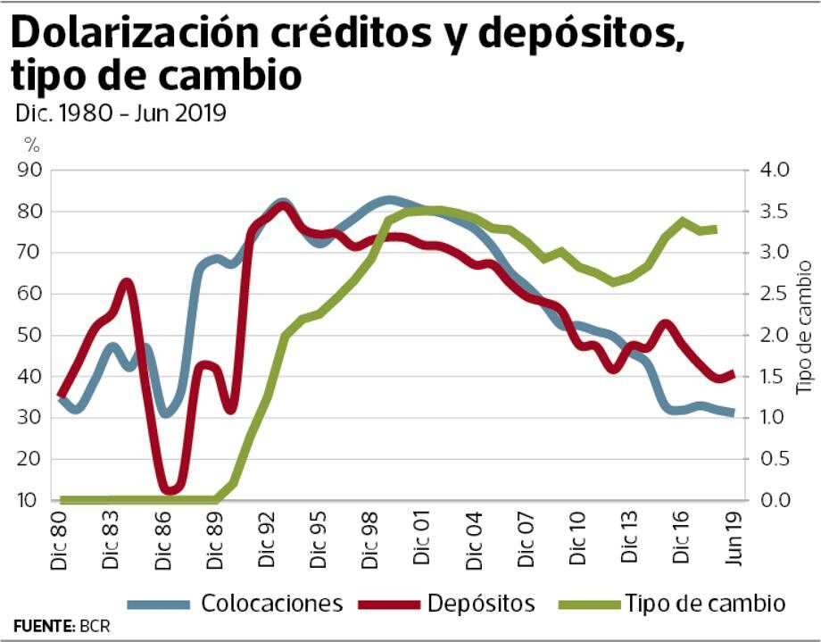 Entre las medidas adoptadas en años anteriores para reducir la dolarización de los préstamos, figura la elevación de los encajes requeridos por el BCR a los bancos que incumplan metas de disminución de créditos en moneda estadounidense.