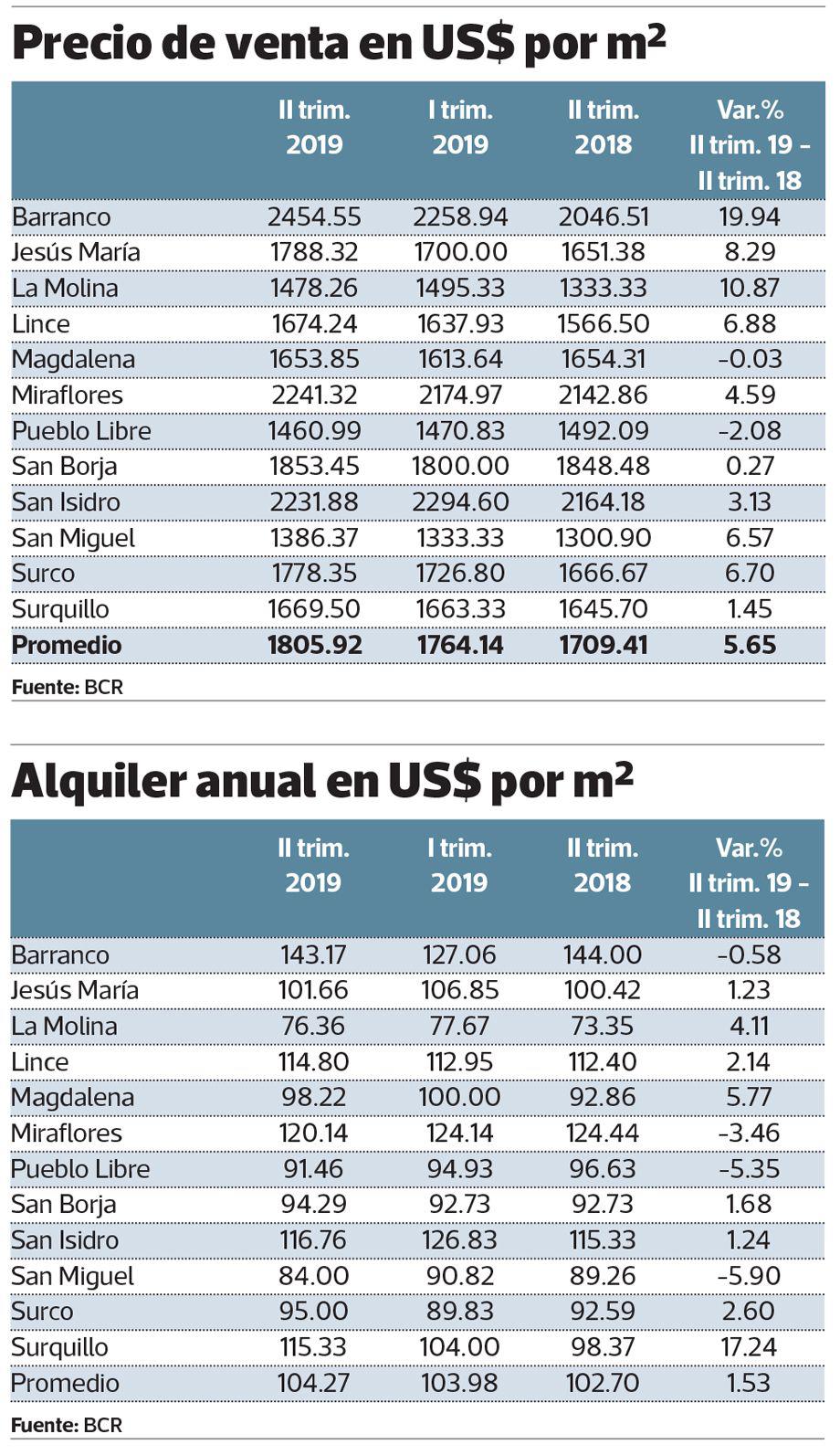 En particular, en el segundo trimestre destacó el alza en Barranco (19.94%) y La Molina (10.87%).