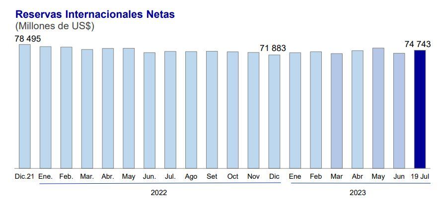 Al 19 de julio de 2023, el nivel de Reservas Internacionales Netas totalizó US$ 74,743 millones, según el último informe del Banco Central de Reserva (BCR).