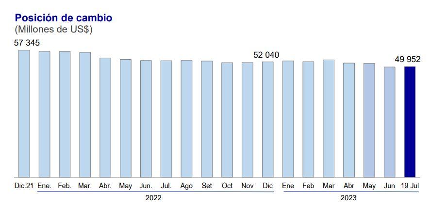 Sobre la posición de cambio, al 19 de julio de 2023, fue de US$ 49,952 millones, un monto menor en US$ 2,088 millones a la del cierre de diciembre de 2022.