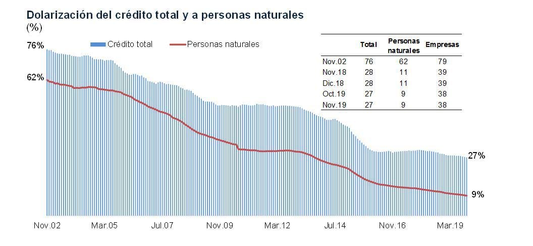 Por el lado de personas naturales, el BCR preció que la dolarización del crédito disminuyó a 9% en noviembre de este año, frente al 11% registrado en el mismo mes de 2018.