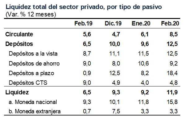 Por monedas, la liquidez en soles aumentó su ritmo de expansión anual de 11.8% en enero a 15.8% en febrero, la tasa más alta desde agosto de 2013; mientras que el componente en dólares se mantuvo con un crecimiento de 3.3% en el segundo mes del año.