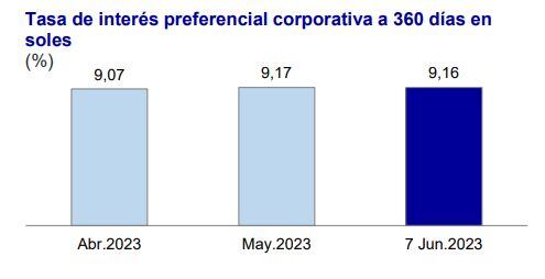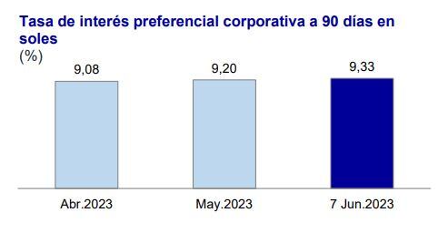 El resumen informativo semanal del BCR también informó que, al 7 de junio de 2023, la tasa de interés preferencial corporativa a 90 días –la que se cobra a las empresas de menor riesgo– en soles subió de 9.20% en mayo a 9.33% anual, y en dólares se ubica en 6.27% anual.