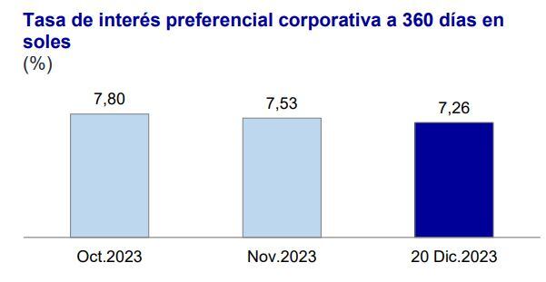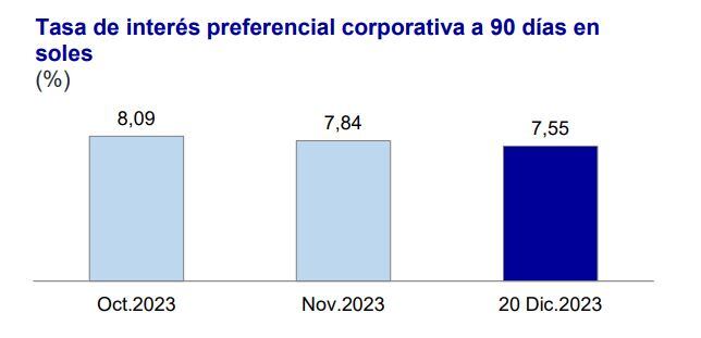 Al 20 de diciembre de 2023, la tasa de interés preferencial corporativa a 90 días –la que se cobra a las empresas de menor riesgo– en soles bajó de 7.84% en noviembre a 7.55% anual en diciembre, según el Resumen Informativo Semanal del BCRP.