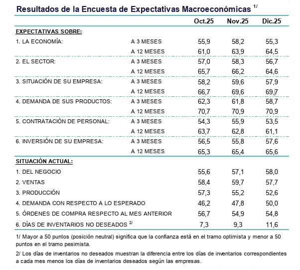 El sentir empresarial respecto al futuro de la economía a 3 meses, lo que abarcaría el primer trimestre del 2026, pasó de registrar 58.2 puntos en noviembre a 55.3 en diciembre.