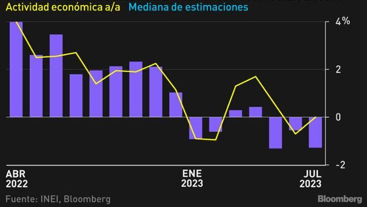La economía peruana se contrajo un 1.3% en julio frente a igual mes del año anterior, superando todas las estimaciones de los economistas consultados por Bloomberg.