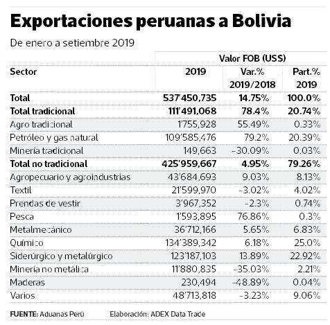 De acuerdo con cifras de Adex, de enero a setiembre último, el Perú exportó a Bolivia mercancía diversa por US$537.4 millones, es decir un promedio mensual de cerca de US$60 millones, en su mayor parte productos siderúrgicos y metalúrgicos, petróleo y gas y agropecuario (ver tabla).