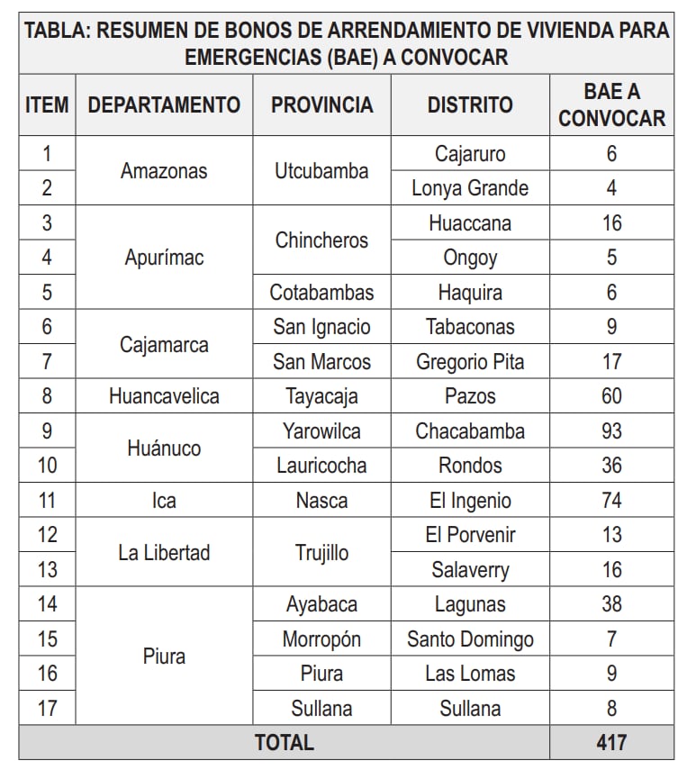 En respuesta al impacto de las intensas lluvias que azotaron diversas regiones del país, el Ministerio de Vivienda, Construcción y Saneamiento (MVCS) aprobó la entrega de 417 Bonos de Arrendamiento de Vivienda para Emergencias (BAE), según la Resolución Ministerial N° 113-2025-VIVIENDA.