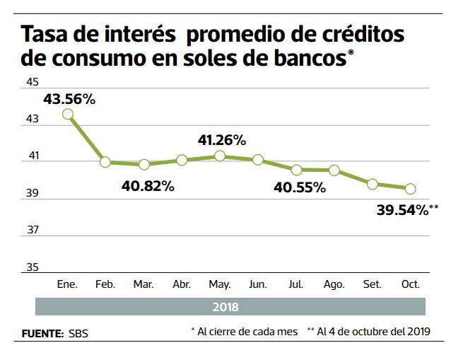 Al 4 de octubre, la tasa de interés promedio anual de los préstamos de consumo en soles de los bancos bajó a 39.54%, nivel menor en 5.4 puntos porcentuales al reportado a fines del 2018 (44.94%), según datos de la Superintendencia de Banca, Seguros y AFP (SBS).