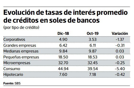 Pero durante el 2019 esta modalidad de créditos no solo es la que reporta más dinamismo, sino también la que exhibe la mayor disminución en sus tasas de interés entre todos los tipos de préstamos del sistema financiero (ver tabla).