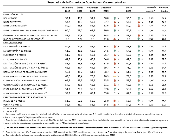 Según la encuesta del BCRP, la expectativa de contratación de personal a 3 meses, que abarca todo el verano y el mes de la primera vuelta electoral (12 de abril), fue el único indicador de este tipo que retrocedió en enero. Pasó de registrar 53.5 a 52.9 puntos en dicho mes.