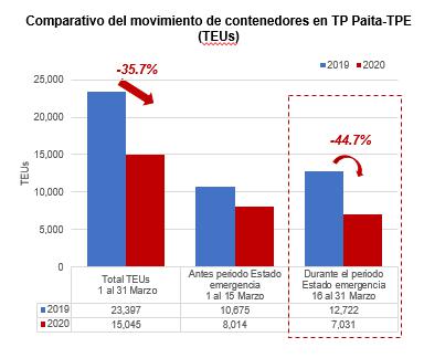 A nivel de contenedores, sin embargo, la carga fue de 15,045 TEUs. Esto significó una caída de -35.7% respecto de los 23,397 TEUs logrados en marzo del 2019.