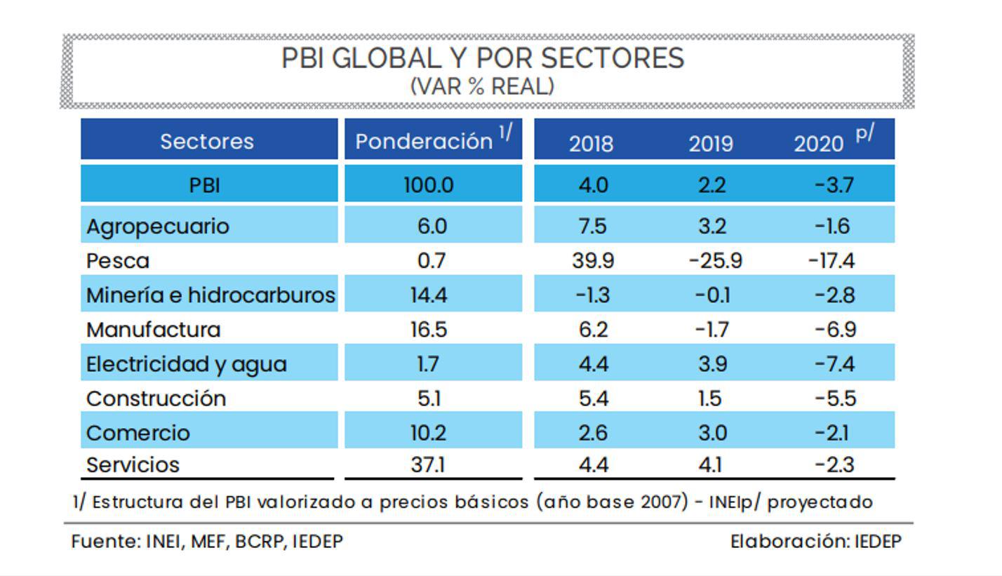 - El sector Manufactura tendría una tasa negativa de 6.9% para el presente año, pues desde el inicio del estado de emergencia, 18 ramas de las 31 que comprenden este sector se han paralizado sus actividades de manera parcial. Entre ellas relacionadas a la fabricación de textiles, prendas de vestir, cuero y calzado, madera, papel, productos químicos, caucho, productos metálicos, maquinaria y equipo, etc.