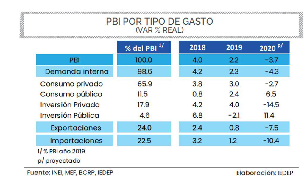 La demanda interna se compone del consumo y la inversión, tanto público como la del sector privado. En esa línea, el IEDEP estimó que el consumo privado (que representa el 65% del Producto Bruto Interno del país) registraría un decrecimiento de más de cinco puntos porcentuales, al pasar de una tasa de 3% en el 2019 a -2.7% para este año, lo que conllevaría a una contracción después de 20 años.
