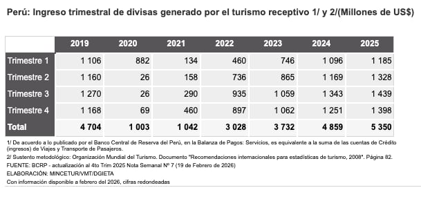 Ello explicaría también porque, a pesar de que aún en cifras de visitantes el turismo extranjero en Perú no recupera sus niveles del 2019, los ingresos de divisas anuales no solo se recuperaron en 2024, sino que en 2025 fueron históricos con US$ 5,350 millones, la cantidad más alta desde 2004, cuando se empezó a llevar registro desde el Mincetur.