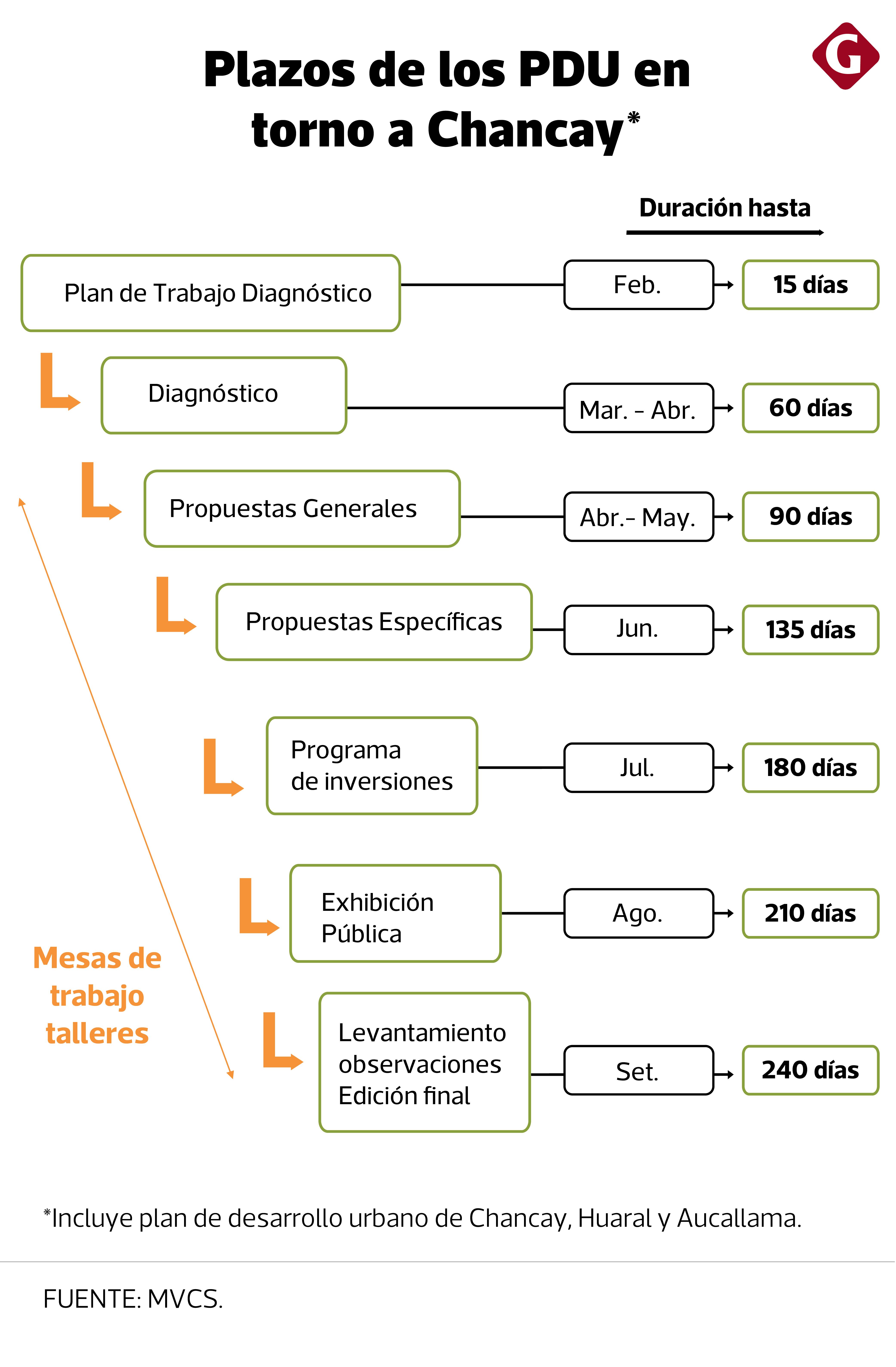 Actualmente, según las fases del proceso de aprobación de los PDU definidas por el MVCS, el plan para Chancay está en la etapa de diagnóstico, que debería culminar en abril. A partir de julio, se empezará a diseñar el programa de inversiones (ver gráfico).