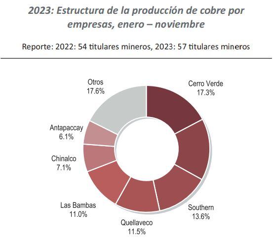 Según Víctor Gobitz, presidente de la Snmpe, la producción del metal rojo va en crecimiento. Muestra de ello es que, pese a las paralizaciones que se registraron en algunas compañías mineras por los bloqueos de carreteras a inicios del 2023, el país habría alcanzado 2.7 millones TMF el año pasado, una cifra sin precedente con aumento de 12.5% a diferencia del 2022 (2.4 millones TMF).