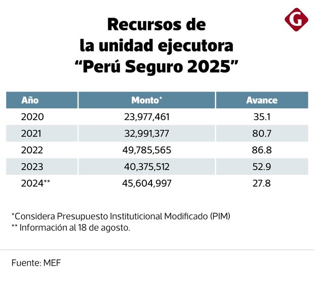 Para este año, Perú Seguro 2025, la unidad ejecutora adscrita al Ministerio del Interior (Mininter), cuenta con un presupuesto de S/45.6 millones y un avance, a mediados de agosto, de menos del 28%. El año pasado, sus recursos ascendían a S/40.3 millones y su ejecución fue de solo 52.9%. Sus acciones están orientadas a proveer la infraestructura y equipo necesarios para el adecuado desempeño de las entidades públicas.