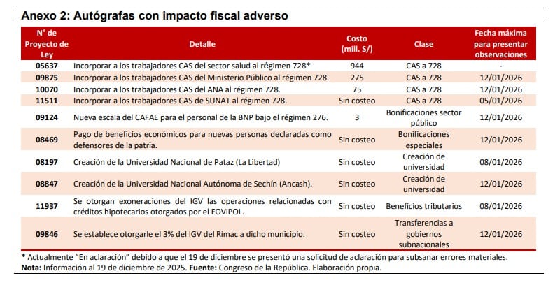 Las otras dos también contemplan la incorporación de trabajadores CAS del Ministerio Público y de la Autoridad Nacional del Agua (ANA) al régimen 728, con costos estimados de S/ 275 millones y S/ 75 millones anuales. El plazo para que se pronuncie el Ejecutivo es el lunes 12 de enero.