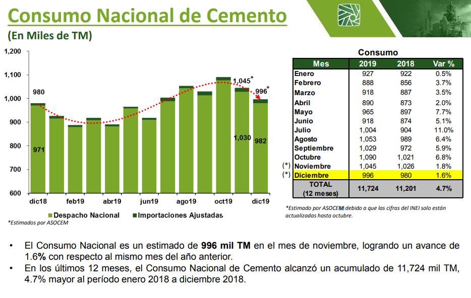 Durante el mes de diciembre, el consumo de cemento fue de 996 toneladas en diciembre del 2019, logrando un crecimiento de 1.6% respecto del mismo mes del año 2018.