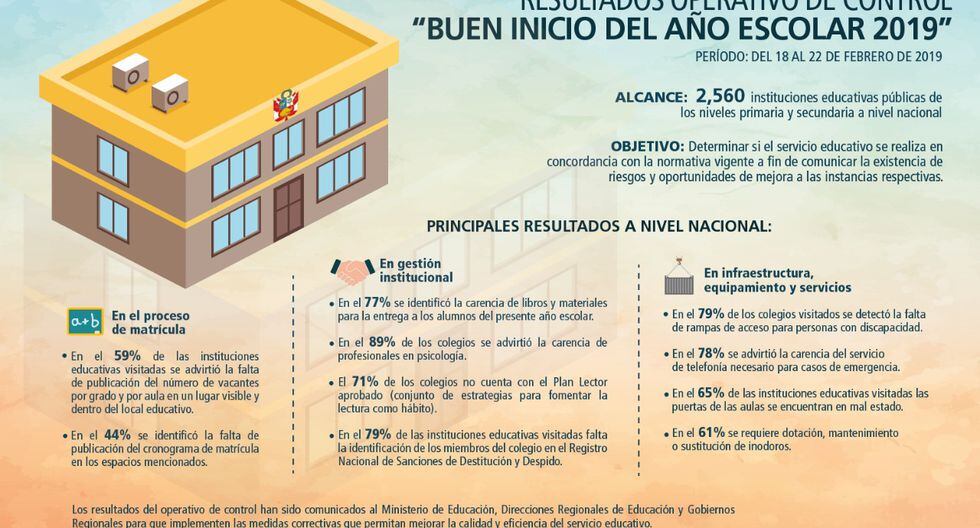 La Contraloría General de la República presentó los resultados de su operativo de control "Buen inicio del año escolar 2019", realizado en 2,560 colegios públicos de los niveles primaria y secundaria de todo el país. El operativo se realizó entre el 18 y el 22 de febrero y reveló las carencias de los colegios públicos antes del inicio del año escolar.