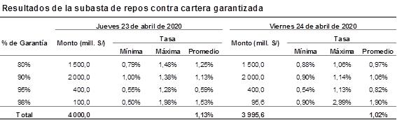 Según los resultados del Banco Central, en la primera subasta se colocó recursos por S/ 1,500 millones, con garantía del 80%, los cuales serán adjudicados a entidades financieras a una tasa de interés promedio de 0.97% anual. Dichos fondos se destinarán a empresas que soliciten créditos por montos de entre S/ 5 millones y S/ 10 millones.