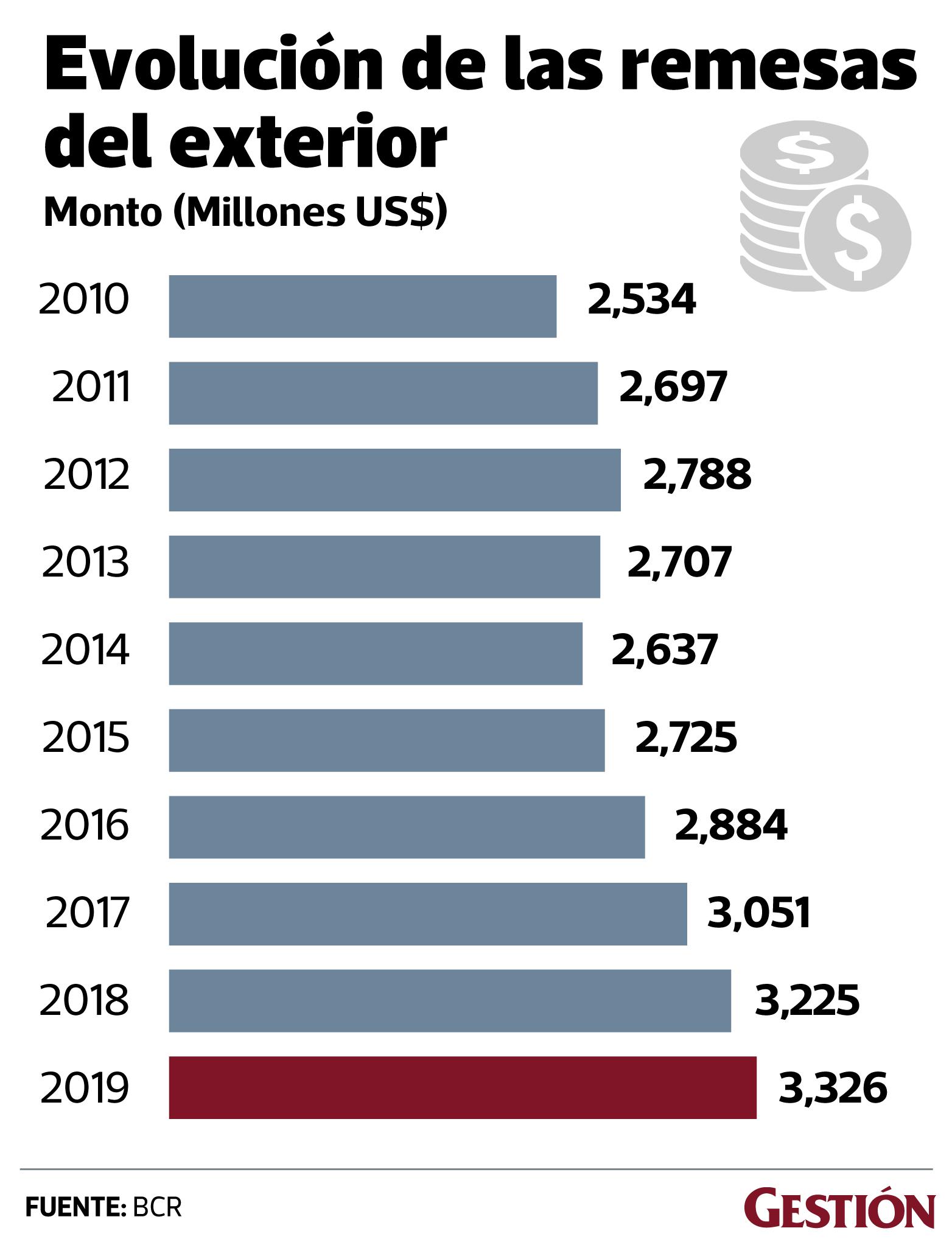 Durante el año 2019, Perú recibió remesas totales por un total de USD 3,326 millones, principalmente de trabajadores peruanos que viven en Estados Unidos, España e Italia, según datos del Banco Central de Reservas (BCR).