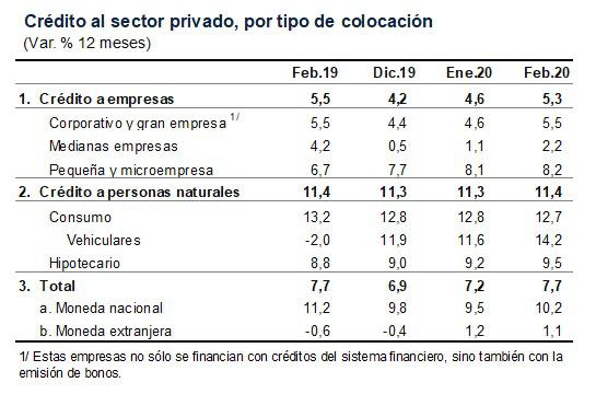 El crédito al sector privado –que incluye préstamos otorgados por bancos, financieras, cajas municipales y rurales y cooperativas– pasó de crecer de 7.2% anual en enero a 7.7% anual en febrero de 2020, reportó el Banco Central de Reserva (BCR).