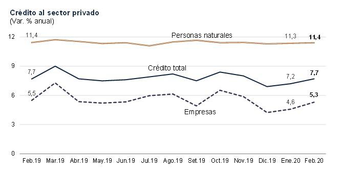 El ritmo de crecimiento de los préstamos a empresas pasó de 4.6% a 5.3% anual entre enero y febrero, mientras el destinado a las personas naturales subió de 11.3% a 11.4% anual.