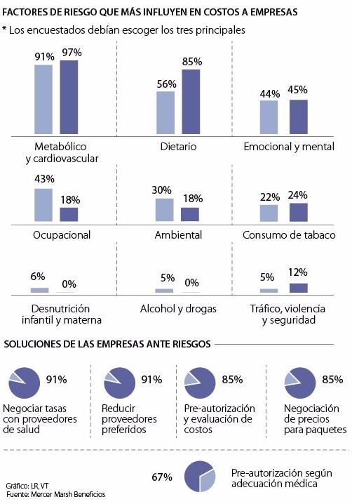 Al preguntarse a las compañías sobre los tres principales factores de riesgo que más influyen en costos a empresas, el índice de selección por los riesgos metabólicos y cardiovasculares fue el que alcanzó un mayor puntaje con 97%, frente a un indicador de 88% el año anterior.