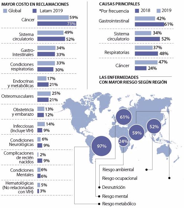 En términos del costo de las reclamaciones, el cáncer sigue siendo la enfermedad de más alto valor con 73% de referencia, seguida de las enfermedades del sistema circulatorio con un 45%, y las enfermedades osteomusculares con 34%. Aunque es importante resaltar que el cáncer ya no es la enfermedad de mayor incidencia en la región, pasando de un primer lugar en 2018 al quinto.