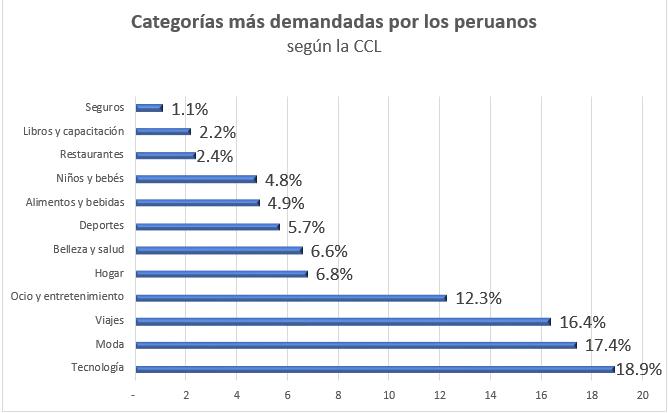 El sector tecnología se ha coronado como la categoría más demandada por los consumidores peruanos (18.9%). Después de él se encuentran los rubros de moda (17.4%) y viajes (16.4%) respectivamente.