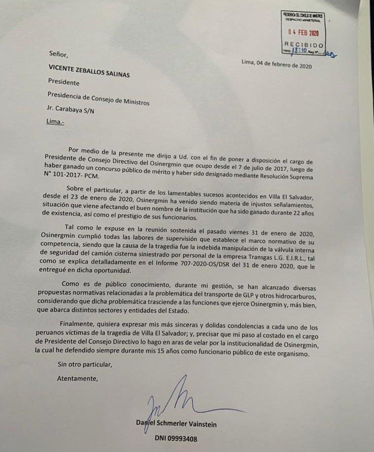 En el final de su carta, Schmerler expresó sus condolencias a las víctimas de la tragedia de Villa El Salvador y aseguró que su renuncia se debe en aras de salvaguardas la institucionalidad del ente regulador.