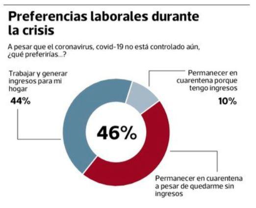 Aquí hay un “empate técnico” entre quienes, pese a que el covid-19 aún no está controlado, prefieren ir a trabajar, y los que les gustaría quedarse aún en casa. El 46% señaló que prefiere permanecer en cuarentena a pesar de quedarse sin ingresos y el 44% quiere trabajar y generar ingresos para su hogar.