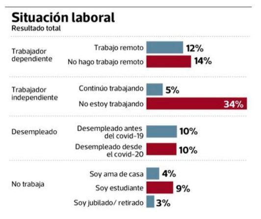 El periodo de emergencia reconfiguró la situación laboral del país. Según la encuesta de Datum, actualmente el 39% de los trabajadores es independiente, de los cuales 34% no está trabajando, especialmente los mayores de 45 años, con una tasa de 44%. Solo el 5% labora.