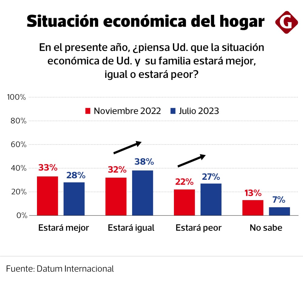 Los números reflejan lo descrito: un 38% de peruanos señala que la situación económica suya o de su familia estará igual este año y un 27% cree que incluso estará peor, así lo reveló la última encuesta de Datum Internacional que compartió con Gestión. Frente a los resultados registrados en noviembre del 2022, ambos porcentajes se incrementaron.