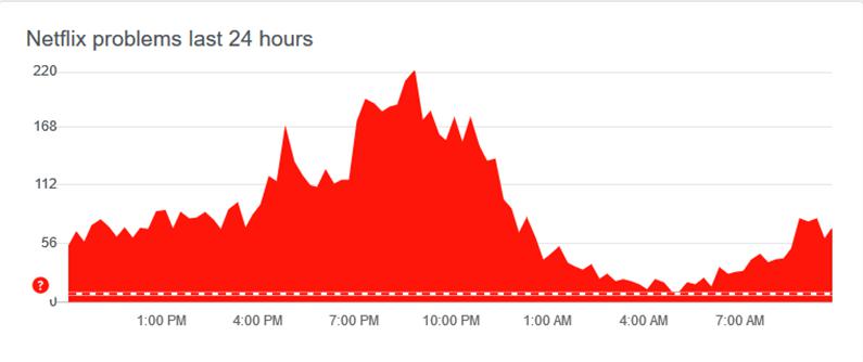 De una revisión de la página Downdetector, la cual mide la cantidad de problemas que tienen servidores de servicios online, se puede ver que en las últimas horas, ha habido varios reportes de averías a nivel mundial. Es más, de un análisis del gráfico de reporte de problemas de Netflix de las últimas 24 horas (a las 10:00 AM del día 21 de marzo), se puede ver que en las últimas 24 horas, hubieron instancias donde se reportaron más de 220 errores por hora.