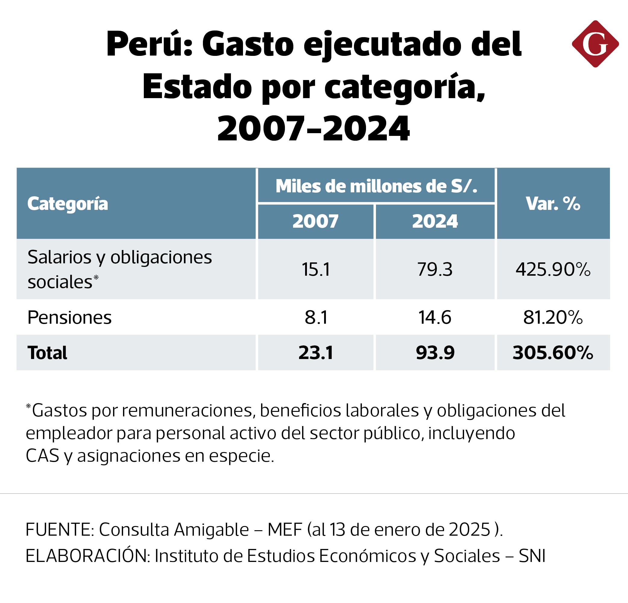 En el 2024, los recursos gastados para estos fines, en acumulado, fueron de S/ 93,900 millones. Esto significó un crecimiento de más de 305%, cuatro veces su valor en solo 17 años, reportó un análisis de la Sociedad Nacional de Industrias (SNI). En desagregado, la categoría de salarios y obligaciones sociales tuvo un incremento de 425%, mientras que la de pensiones de 81%.