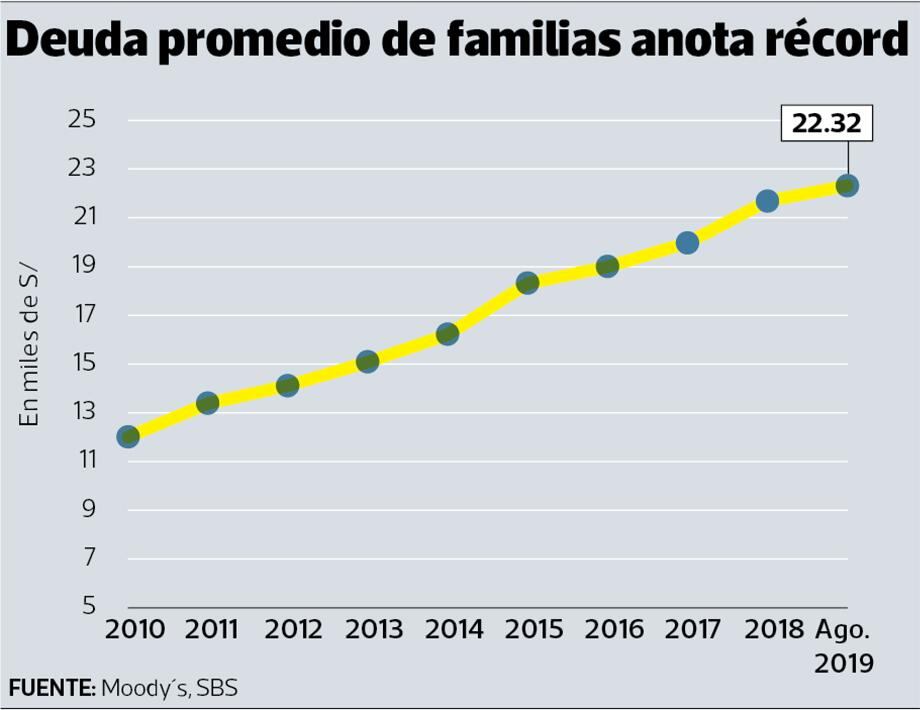 Un reciente reporte de señala que la deuda promedio de los hogares peruanos alcanzó en agosto de este año un nivel récord de S/ 22,300 (US$ 6,700). Desde el 2010, la deuda de las familias aumenta constantemente a una tasa de crecimiento anual compuesta de 6.4%, indica el informe.