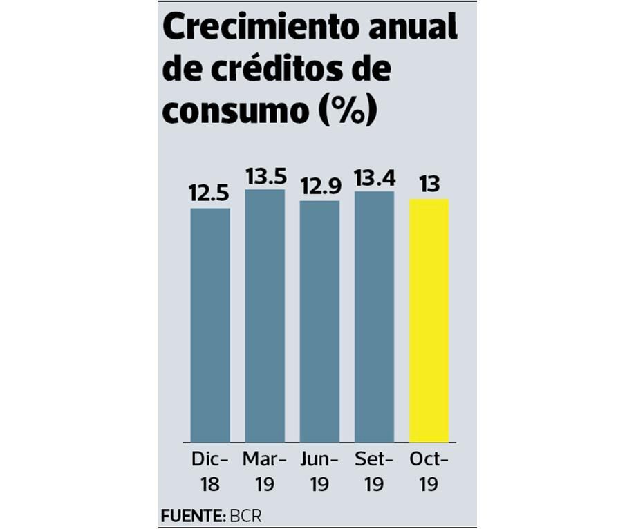 A octubre último, los préstamos de consumo otorgados por las entidades financieras sumaron S/ 78,976 millones, monto que representa una expansión de 13% respecto a igual periodo del 2018, según datos del . A la misma fecha, los créditos hipotecarios totalizaron S/ 51,636 millones, con un avance anual de 9%.