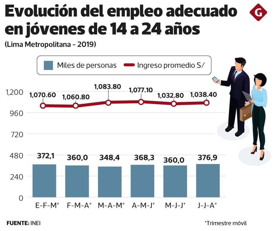 Es preciso mencionar que en el último trimestre del año (junio, julio y agosto) un total de 376,000 jóvenes de 14 a 24 años de edad cuenta con un empleo adecuado, una cifra inferior respecto a los 394,900 jóvenes que se habían reportado en similar periodo del año pasado, de acuerdo a cifras del INEI. En otras palabras, en este periodo 18,900 jóvenes dejaron de tener un trabajo en óptimas condiciones.