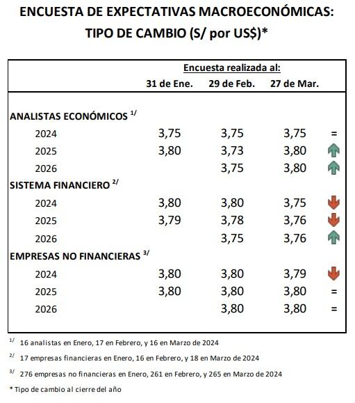 En el caso de los analistas económicos, en la encuesta realizada a fines de marzo estos mantuvieron su estimado de S/ 3.75, similar a lo previsto en la anterior encuesta de fines de febrero.