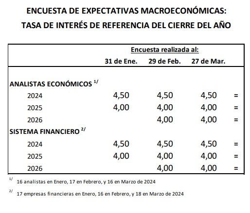 Por otro lado, respecto a la tasa de interés de referencia del BCRP, actualmente en 6.25%, tanto los analistas económicos como las empresas del sistema financiero mantuvieron su proyección de que esta tasa de referencia disminuya a 4.5% hacia fin de año (ver cuadro).